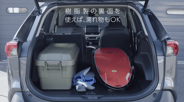 さらにデッキボードの裏面は樹脂製なので、上下を入れ替える事で、サーフボードやウェットスーツから滴る水滴が垂れても気兼ねなく積み込む事ができ、泥で汚れた荷物を積む時も掃除が楽になります。
