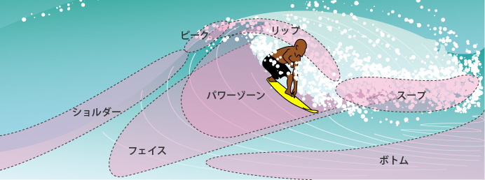 この2方向の力が最も強いパワーゾーンにサーフボードを運ぶことで、サーフボードは波に押され続けます。
