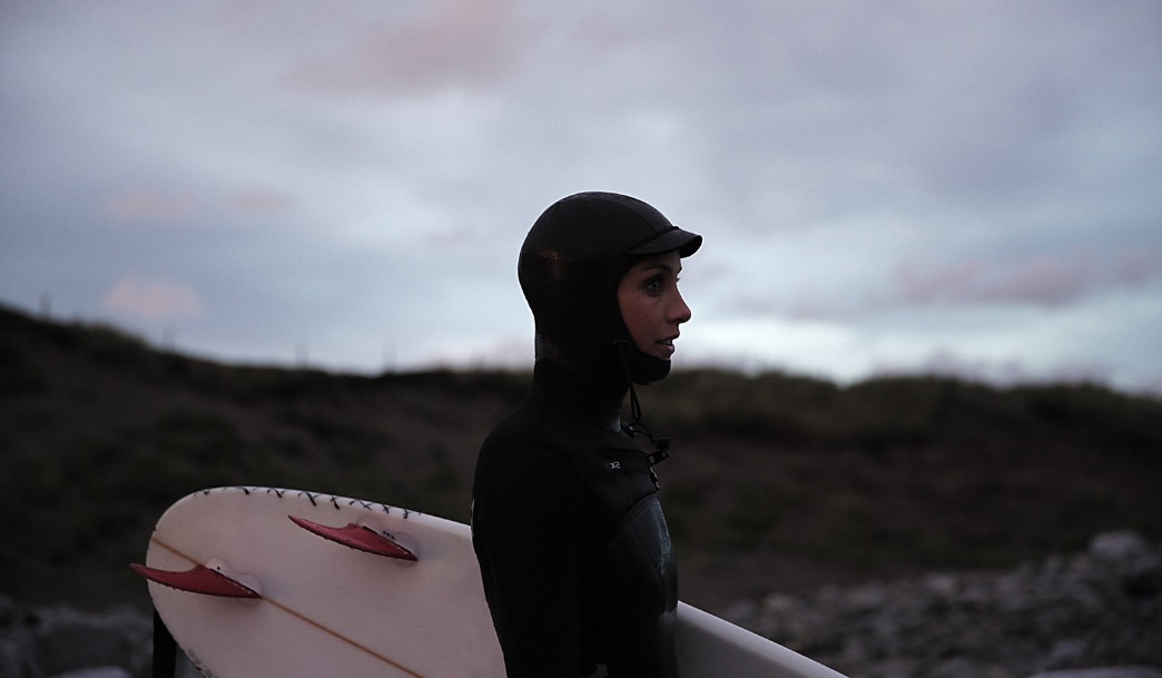 ヘッドキャップをかぶった完全装備のサーファーが北極でサーフィンする映像をお届けします