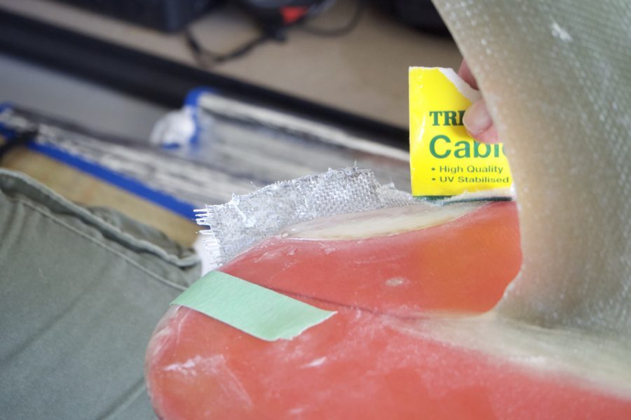 塗った樹脂が完全に固まったら、その上からガラスクロスを貼って、強度をさらに高めます。
