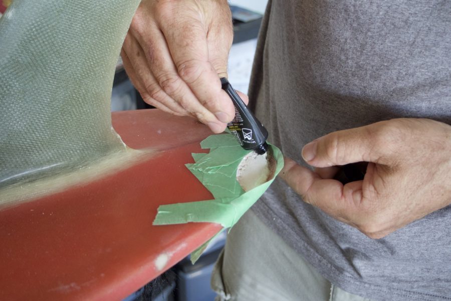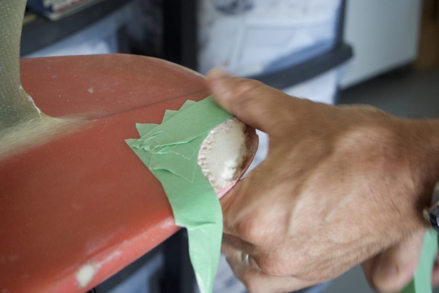 ガラスクロスを修理した箇所の上に置いて、マスキングテープを使ってサーフボードに固定してください。