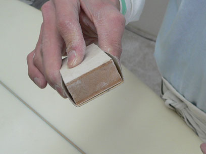 修理箇所の表面と周りが少しザラザラになるまでサンドペーパーで削ります。