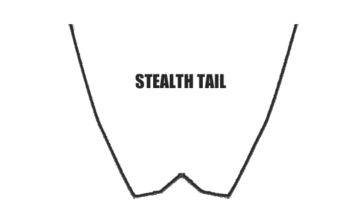 スワローテールのようにテールに切り込みが入っているのですが、左右の角を残した形状をしており、スワローテールのテールを沈めやすくクイックな反応を得られるところと、スカッシュテールのハイレスポンス感も得られるといった両方のメリットを活かせるようミックスさせたテールデザインと言えます。