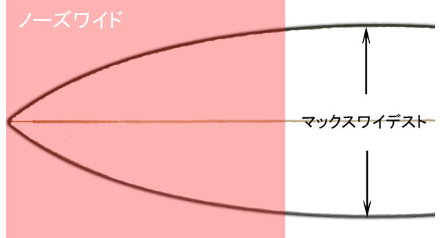 ノーズが細めなボードほど、比較的マックスワイドは細目になります。