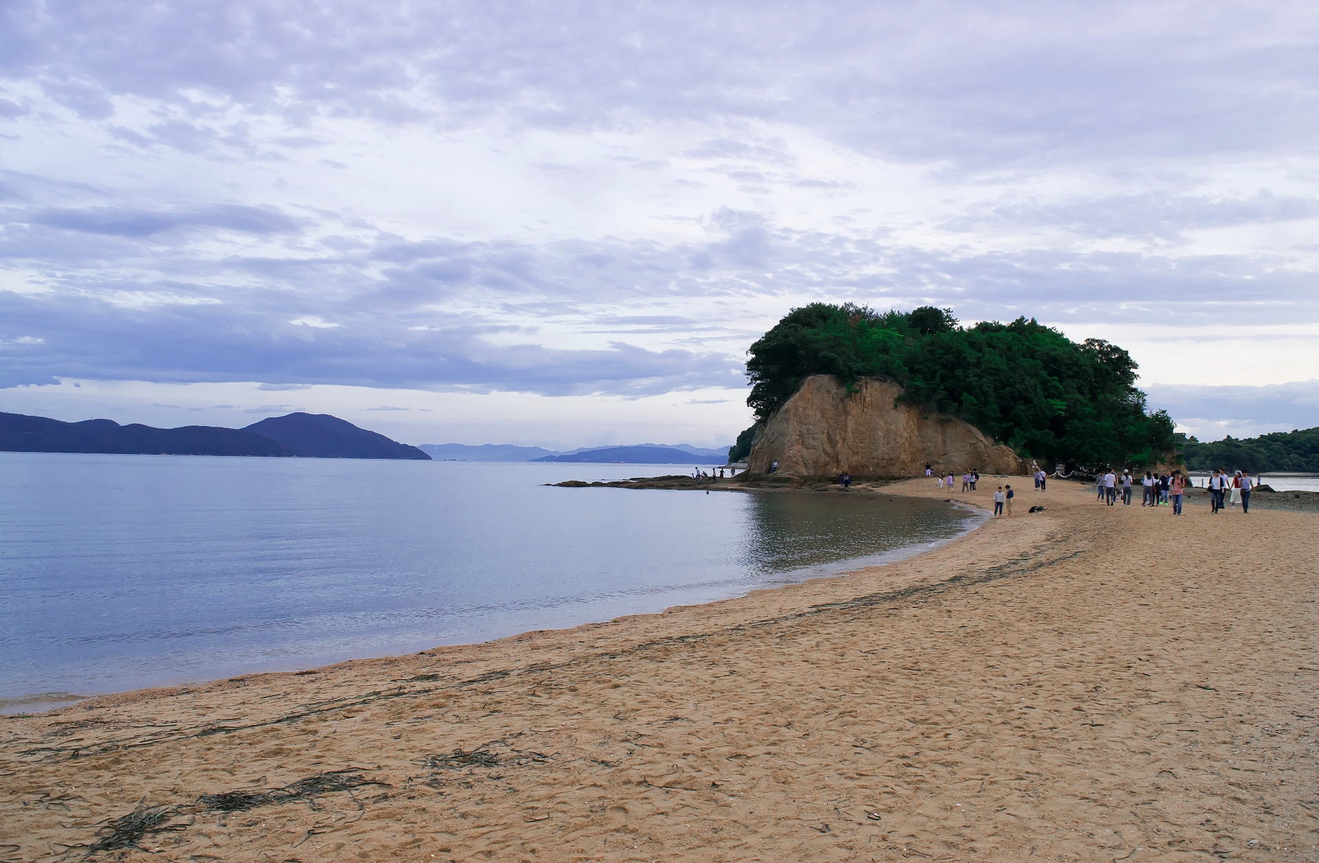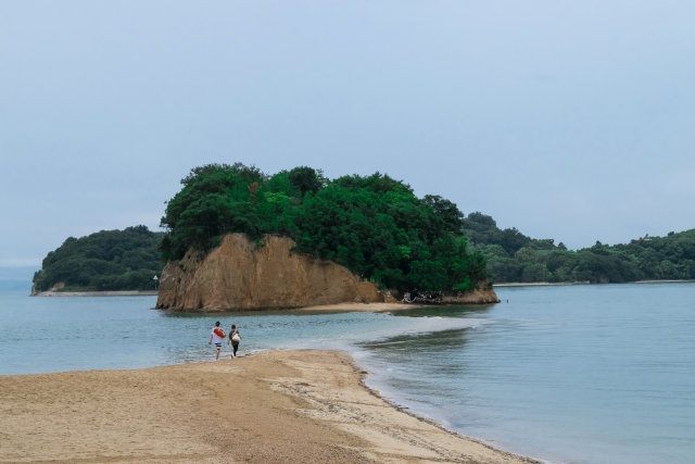 香川県にある砂洲、エンジェルロードの干満差の様子。