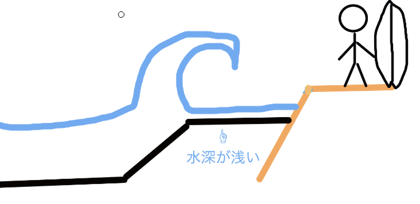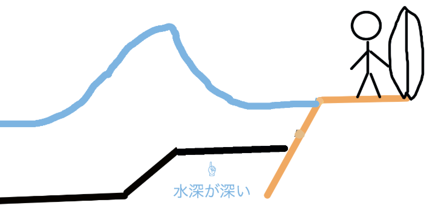 ハイタイドは海底までの水深が深くなるので、うねりのパワーが小さいと波が割れずらい特徴を持ち、波のピーク(※)が岸寄りになります。
