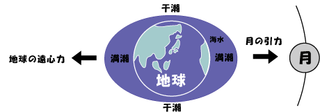 月の引力と地球の遠心力でラグビーボールのように楕円形になった海面の中で、低い部分が「干潮(引き潮)」になります。