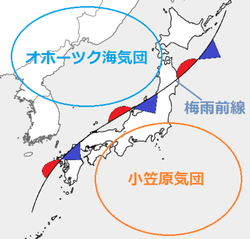 日本の北側にあるオホーツク海気団と南側の小笠原気団がそれぞれ発達し、小笠原気団がオホーツク海気団を北へ押し上げる事で、季節が夏へと移り変わりますが、この2つの気団の勢力は共に同じくらいなので、お互いに押し合ったまま、なかなか移動してくれません。